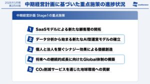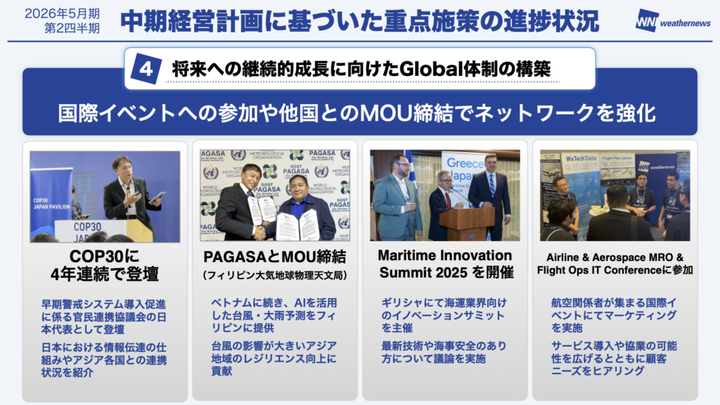 本日登壇している執行役員の安部が何枚かの写真に写っておりますが、世界を渡り歩いております。COP30への4年連続登壇、フィリピン気象局とのMOU締結、ギリシャでの海運サミット開催、アジアでの航空マーケティングイベントへの参加などを行いました。