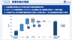③AIの効果: 主にBtoB事業の運営効率化にAIが寄与しており、前年同期比での人件費減少という形となって利益を押し上げる形になっております。