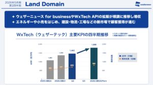 Land: 国内を中心に様々な企業からWxTech(ウェザーテック)サービスの引き合いをいただいており、増収となりました。