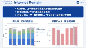 InternetドメインではQ2単独、および上半期合計の売上の両方で過去最高を更新し、四半期の累積DAU(daily active users)も過去最高を更新しました。