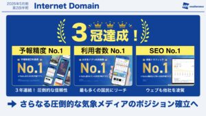 また、Q2に関しては「3冠達成」ということで、予報精度、アプリ利用者数、SEO(ウェブ流入数)の3つでNo.1の評価を外部調査機関からいただきました。ここからがスタートと考え、さらに圧倒的なメディアになって売上成長を実現していこうと考えております。