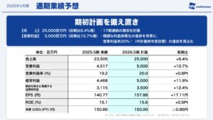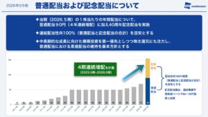 普通配当についても現在4期連続で増配中ですが、今期はプラスアルファで記念配当を行い、連結配当性向100%(普通配当と記念配当の合計)を目安にする、という構造になります。