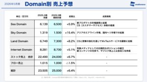 ドメイン別の売上に関しても、SeaからSkyとInternetへ若干の入り繰りはあるものの、トータル250億円については変更ございません。