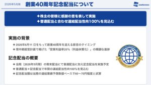 今期は創業40周年記念ということで記念配当を実施する予定です。40年間支えていただいたステークホルダーの方々への感謝を込めておりますのと、営業利益率20%以上が見えてきたこともあり、株主還元に実施してまいります。