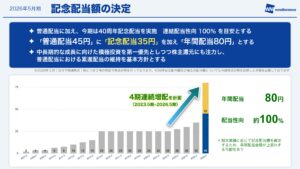 最後ですが、記念配当でございます。今回、記念配当が35円、年間配当に関しては80円という形で金額を発表させていただきます。最終的には配当性向100%が目安になりますので、利益がこの後に上がった場合、記載にある通り、年間の配当金額が上振れする可能性はあります。