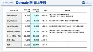 Domain別の売上に関しても据え置きで変更はございません。Sea DomainとLand Domainはもう少し頑張りたいというところがありますが、Sky DomainとInternet Domainは引き続き売上を伸ばして、最後まで諦めずに売上達成を狙っていきたいと考えています。