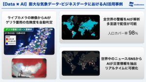 ここに載せてるのは全てではありませんが、例えばライブカメラを見ることによってゲリラ雷雨の検知が出来、それをもとにアラートを送ったり予報を作るということが出来ます。警報に関しても、全世界の警報、もちろん全ての別々の言語で発表されているテキスト情報をしっかりとAIが翻訳してデータ化する。もうすでに我々人口カバー率で98%まで全世界の警報・注意報をデータベース化しております。