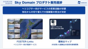 続いてSky Domainです。こちらはヘリコプター向けのサービスの一例になりますが、我々の強みであるカメラのAI画像解析を用いて、今まで無理だと考えられていた霧の検出を行うプロダクトです。このようにプロダクトにどんどん新しい技術を入れることによって大手顧客から新たな受注をいただいており、順調に売上が伸びております。