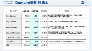 Sky Domainに関しましては、引き続き非常に順調にアジアのエアライン市場、そして国内ヘリ市場を中心に増収が続いています。
