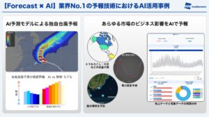 続きまして、予報です。こちらも本当にたくさんあるので紹介出来るのはごく一部ですが、例えば最近はAIが台風を予測します。この件はコーポレートブログで詳細を書いておりますが、今はAI予測モデルの方がどの気象機関の物理モデルよりも当たるという結果が出ています。そういったものをいち早く利用して、我々のサービスに役立てております。