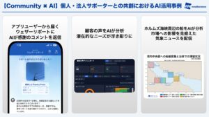 このように予報そのものに関してもAIがかなり効いてきていると感じております。予報が良くなると、最終的にコミュニティが出来上がり、お客様が集まってきます。これまでは全てのお客様一人ひとりに対して、例えばコンテキストに合わせて返信したり問い合わせするということが中々できませんでした。AIは多種多様なお客様に対してコンテキストに合った形で適切なサジェスチョンをするとか、適切なアドバイスをすることができるようになりました。しかも自然言語でマルチランゲージで出来ます。こういったところでもAIでコミュニティの価値を上げているところです。