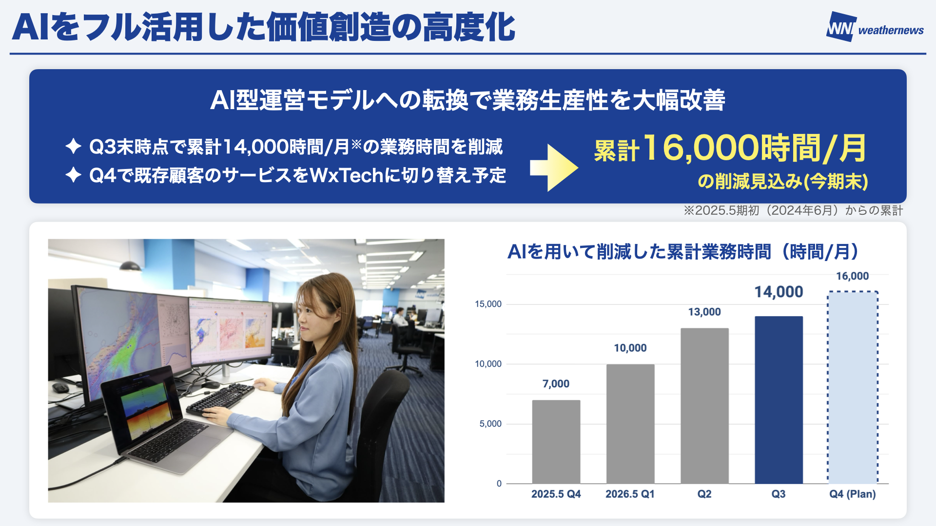 まずはAIの得意なところである運営の効率化。我々がこのプロジェクトを開始してから今期末には月間で16,000時間、我々の運営が効率化され生産性が向上するであろうと見ています。