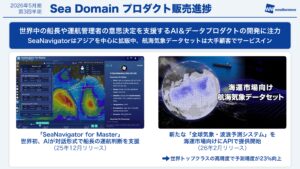 プロダクト戦略に関しては主に二つあり、まずはこちらのSeaNavigatorです。ここ(左側画像の右のチャット画面)にAIが載っておりますけども、AIが強力に船をサポートするこのプロダクトと、もう一つはこのデータセットです。データのみの販売においても高精度な予測のデータ販売を開始しておりまして、プロダクトパッケージとその元となるデータ、この二つが我々の主なプロダクト戦略になります。
