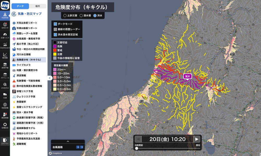 台風情報のほか、雨雲レーダーや落雷リスク、危険度分布(キキクル)、気象警報・可能性情報、風の予想、停電リスク、河川水位情報、風の予想、ライブカメラなど、20種類を超えるさまざまな気象・防災情報について確認することもできます。より詳細な台風情報を対策にお役立ていただけます。