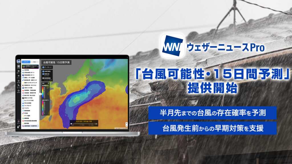近年、日本列島の近海で台風が発生し、短時間で接近・上陸するケースが増えており、より早い段階から台風のリスクを把握したいというニーズが高まっています。当社ではこのようなニーズに応えるため、新機能「台風可能性・15日間予測」を新しく開発し、有料会員限定サービスとして「ウェザーニュースPro」で提供を開始しました。