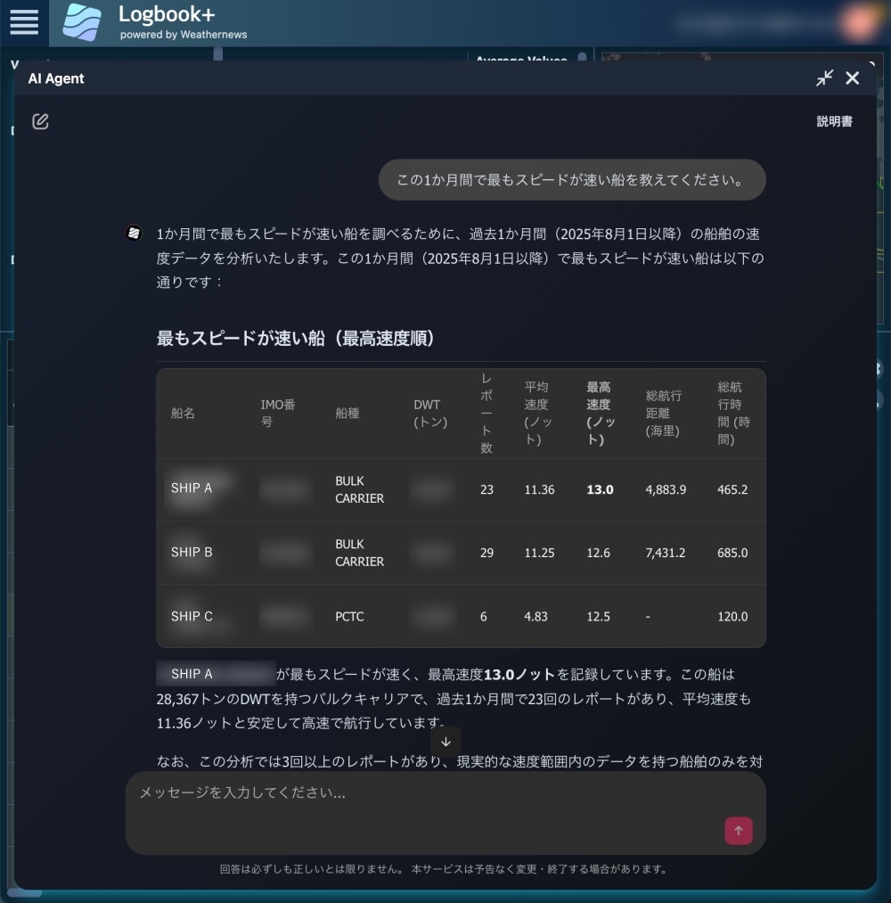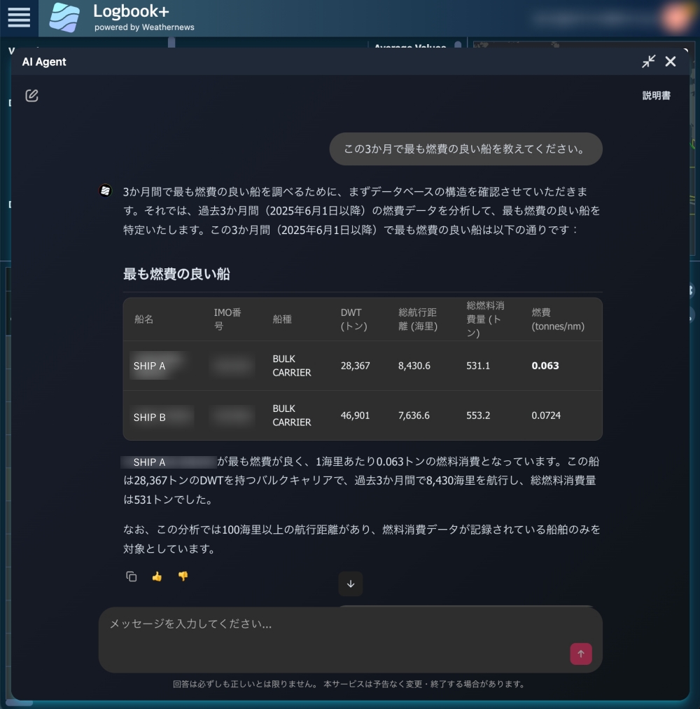 「AI Agent」は、契約船舶に関する膨大な航海データをもとに、従来、人手による分析では時間を要していた船舶性能に関する情報をチャット形式で取得できます。「AI Agent」は、契約船舶の性能データのほか、航海基本情報(IMO番号や船舶仕様など)、航海履歴、船舶の位置情報にもアクセスできます。そのため、例えば「自社の船舶の中で、過去3か月で燃費が最も高く、スピードも速い船をランキングしてほしい」や「有義波高が4mを超える場合に、最も燃費の良い船を教えてほしい」とチャット形式で質問するだけで、テキストやグラフ、チャートで分析結果を得られます。これにより、従来のように複雑なフィルターを手動で設定したり、複数の画面を行き来したりする手間がなくなり、分析にかける時間や質が大幅に改善します。