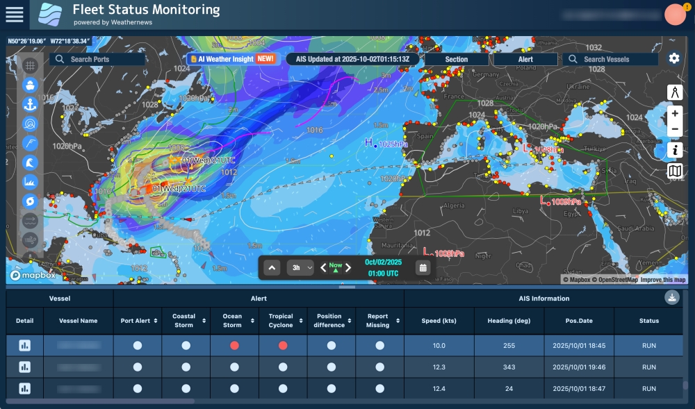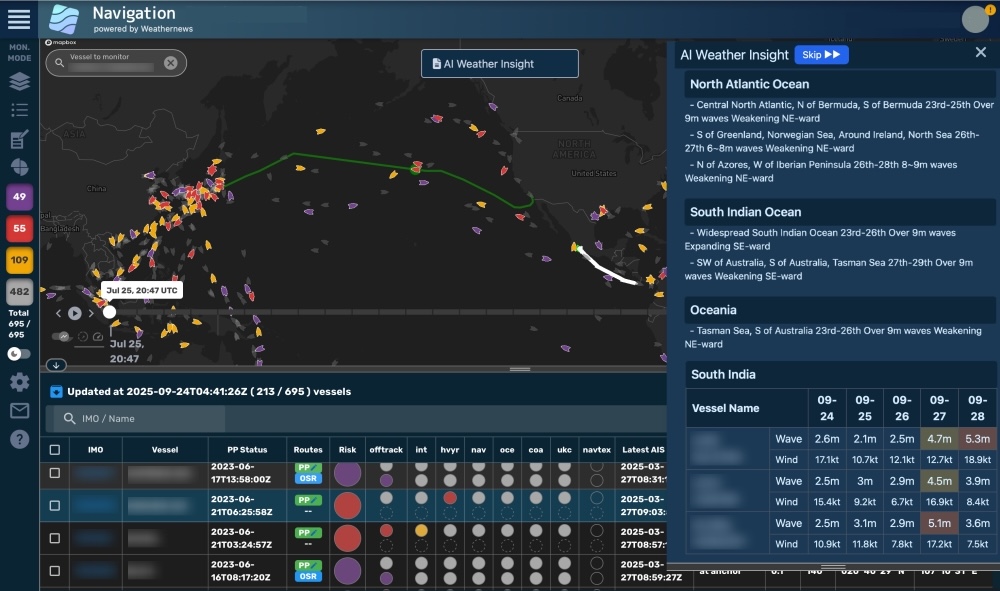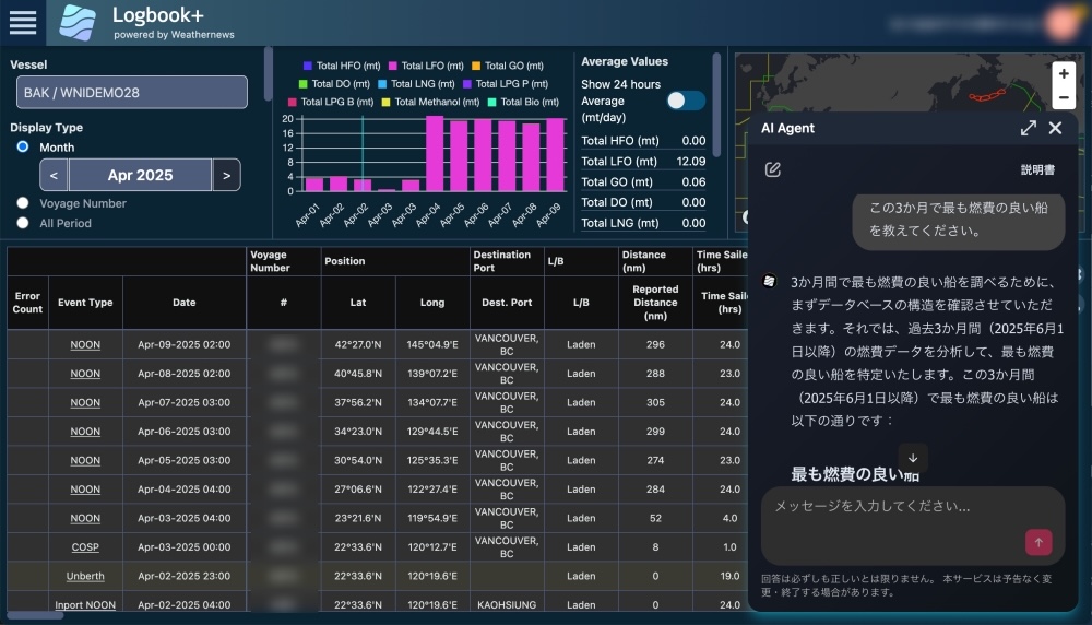 海上気象 > 航海気象 >株式会社ウェザーニューズ(本社:千葉市美浜区、代表取締役社長:石橋 知博)は、船舶の環境性・安全性・経済性に配慮した運航を支援する統合型の航海気象サービス「SeaNavigator」にAIエンジンを搭載し、新たに気象・海象見解の自動生成や荒天影響船を自動抽出する「AI Weather Insight」と、膨大な海象や航海データの分析で運航最適化を支援する「AI Agent」の提供を開始しました。