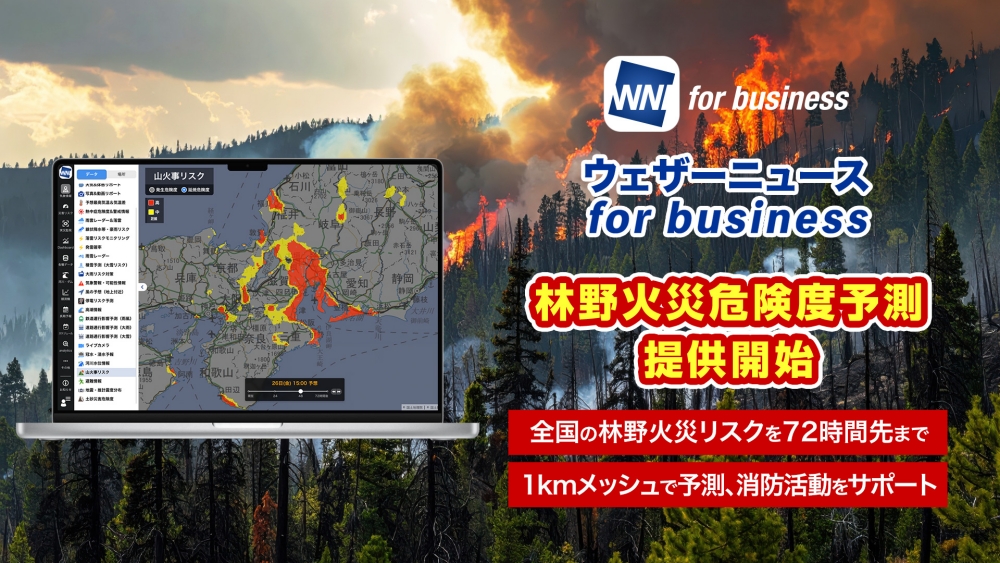 防災気象 >株式会社ウェザーニューズ(本社:千葉市美浜区、代表取締役社長:石橋 知博)は、法人向け気象情報サービス「ウェザーニュース for business」において、本日より林野火災危険度予測サービスの提供を開始しました。当社は、総務省消防庁が発出した「林野火災の予防及び消火活動について(通知)」の改正を受け、全国の自治体による林野火災注意報・警報の迅速かつ的確な発令をサポートするため、本サービスを開発しました。当社の3年連続予報精度No.1※の気象予測技術と詳細な森林の現況データを組み合わせることで、72時間先まで、1kmメッシュの高解像度で「発生危険度」と「延焼危険度」を予測します。