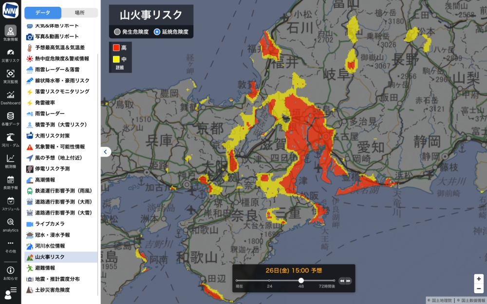 「発生危険度予測」、「延焼危険度予測」ともに1kmメッシュ、72時間先まで、1時間ごとの詳細な予測を提供し、消防活動を強力にサポートします。