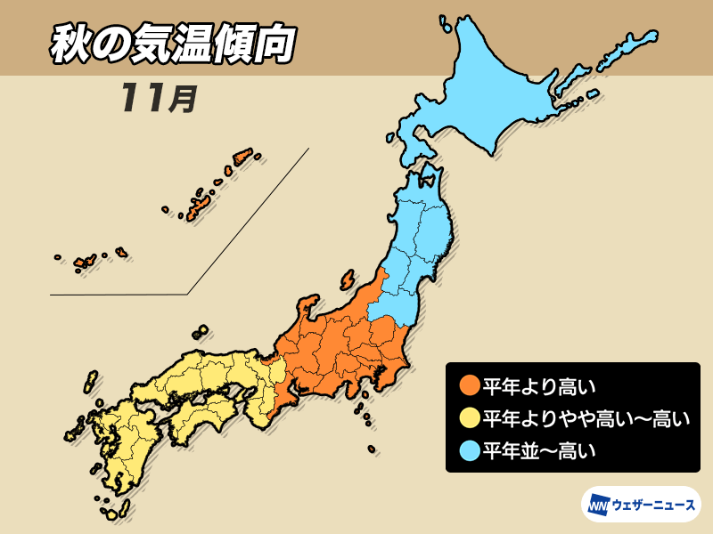 秋:11月は比較的あたたかいが、寒気流入のタイミングで北日本を中心に平年並の寒さに