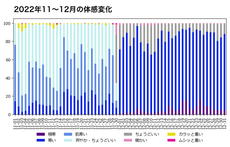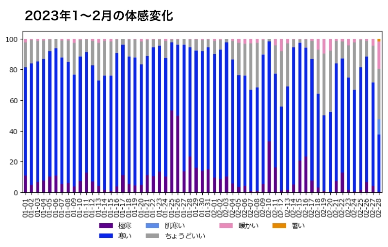 2022年11月は気温が高かったものの、12月に入ると一気に気温は下降、特に12月下旬~年明けおよび、1月下旬に気温の低い時期がありました。東京の体感データを見ると、11月後半は「肌寒い」と「寒い」を合わせても半数程度でしたが、12月に入ると「寒い」の割合が7割を超えるようになりました。また、1月は下旬に「極寒」となった日もあるなど「寒い」1か月となり、2月に入ると「寒い」の割合が少ない日もたびたび現れるようになりました。