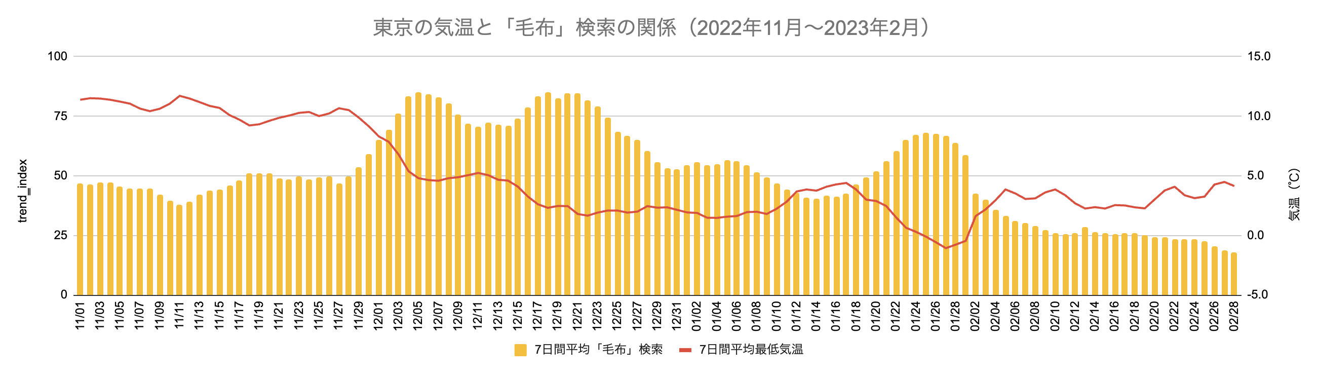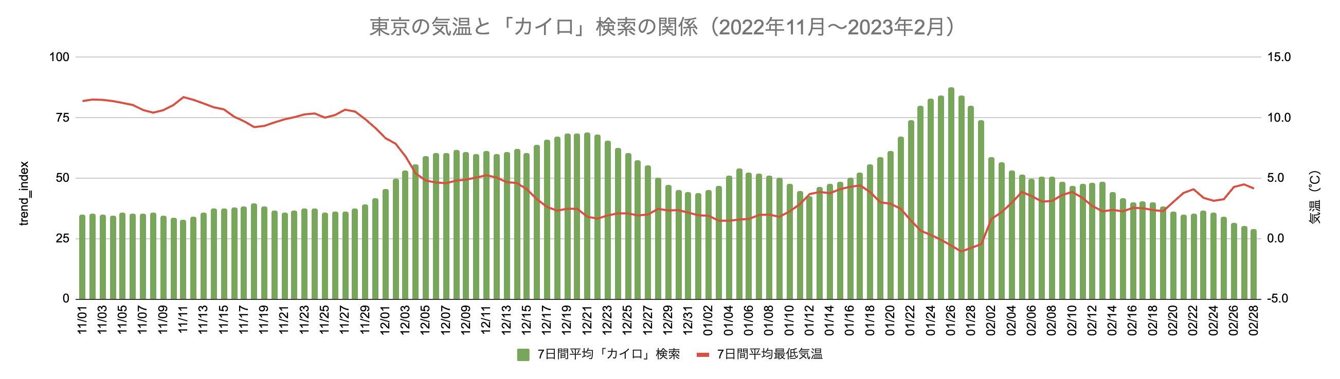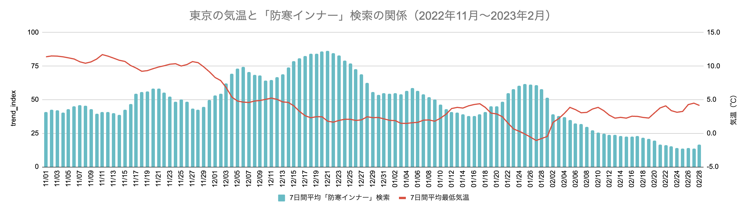 当社流通気象チームの気象データアナリストは、過去の11〜2月のGoogle検索数の傾向と気象データの関係を分析し、今シーズンの秋冬の気温傾向をもとに季節商品が注目される時期を予想しました。