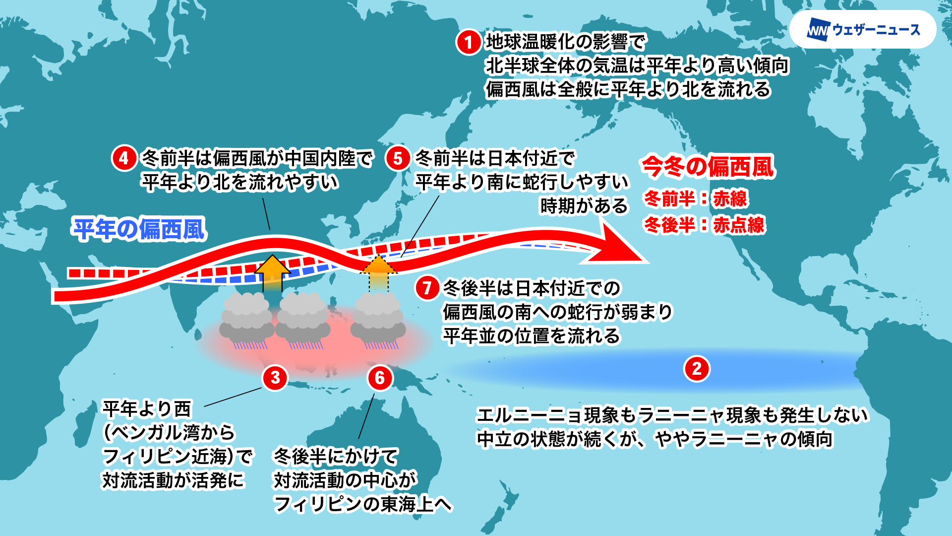 冬も引き続き北半球全体の気温が平年より高い状況で、偏西風は平年よりも北を流れやすい状態が継続するものの(①)、1月にかけて(冬前半)はラニーニャ気味の海面水温分布の影響(②)で、熱帯の対流活動が平年より西で活発になる予想です(③)。このため、1月にかけて中国内陸の偏西風は平年よりも北を流れやすく(④)、日本付近で平年より南に蛇行しやすい時期がある見込みです(⑤)。この偏西風の蛇行により日本付近に平年より強い寒気が入る可能性があります。