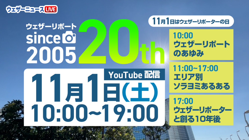 モバイル/インターネット >株式会社ウェザーニューズ(本社:千葉市美浜区、代表取締役社長:石橋 知博)は、ウェザーニュースアプリで空や天気の写真や動画を投稿し、共有する取り組み「ウェザーリポート」が20周年を迎えることを記念し、YouTube登録者数150万人の気象情報番組「ウェザーニュースLiVE」にて、2025年11月1日に、特別番組『ウェザーリポート20周年感謝祭〜ウェザーリポーターミーティング〜』を配信いたします。