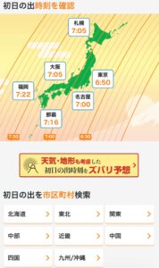 『初日の出時刻ズバリ予想』は、ウェザーニュースのアプリまたはウェブサイトの『初日の出情報』よりご利用いただけます。なお、12月30日までは翌日の日の出時刻を、12月31日〜1月1日にかけて2025年の初日の出時刻を表示します。
