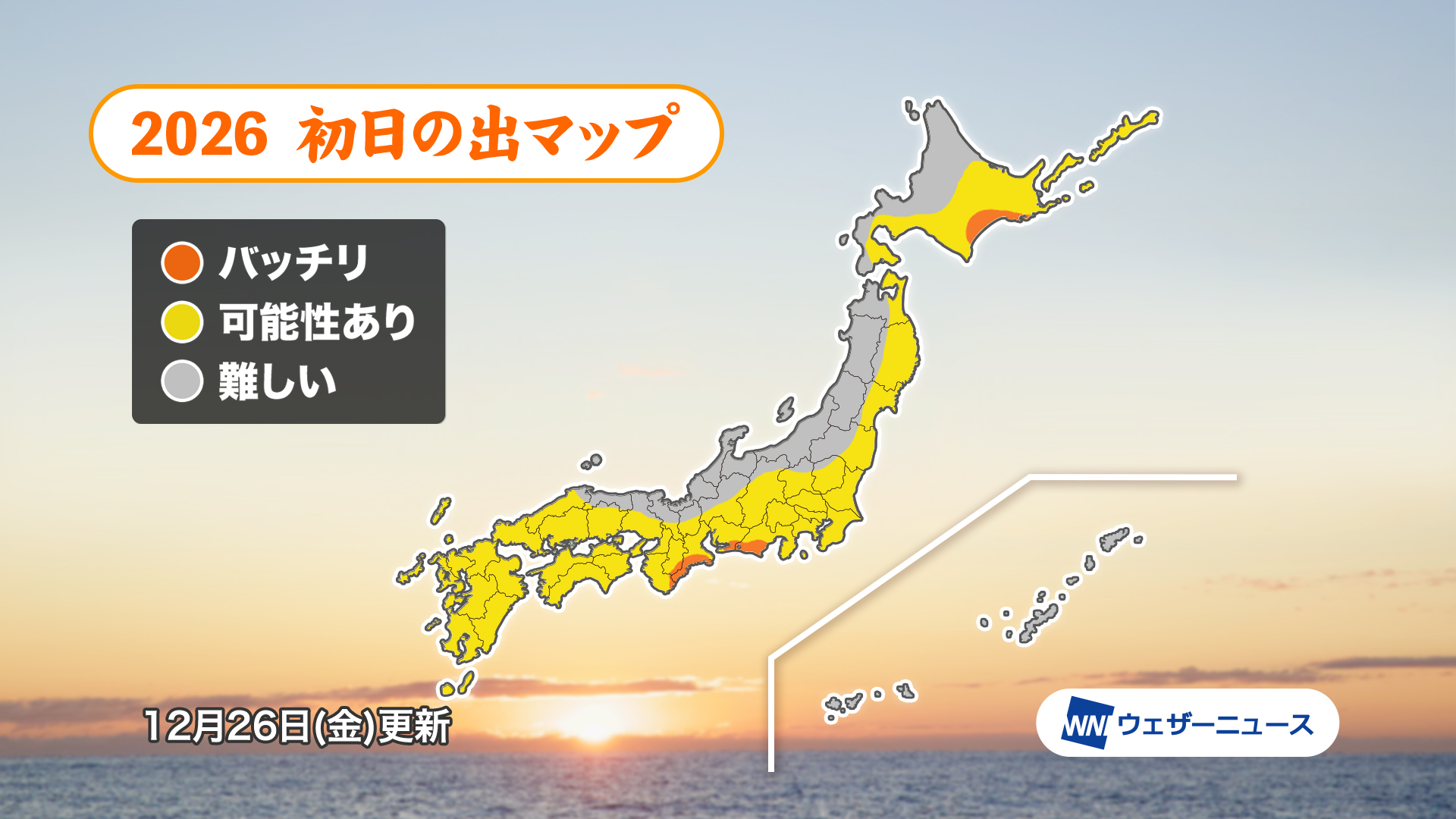株式会社ウェザーニューズ(本社:千葉市美浜区、代表取締役社長:石橋 知博)は、スマホアプリ「ウェザーニュース」で『初日の出情報』をオープンし、2026年の初日の出時刻や最新の気象情報の提供を開始しました。元日は冬型の気圧配置となり、北海道の太平洋側と東海の太平洋側の一部地域で初日の出を高い確率で見られる予想です。東北太平洋側〜九州にかけては雲が広がりやすいものの、雲間や雲の上から初日の出を見られる可能性があります。大晦日の夜から元旦にかけてはこの時期らしい冷え込みになるため初日の出を見に行く際はしっかりと防寒をした上でお楽しみください。