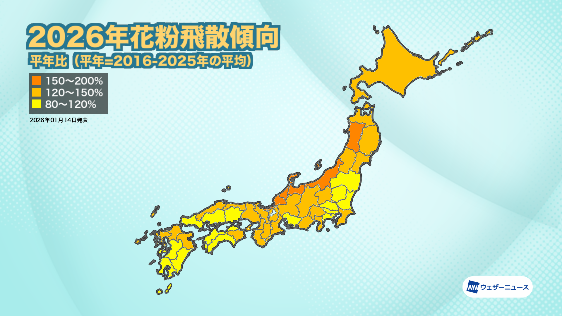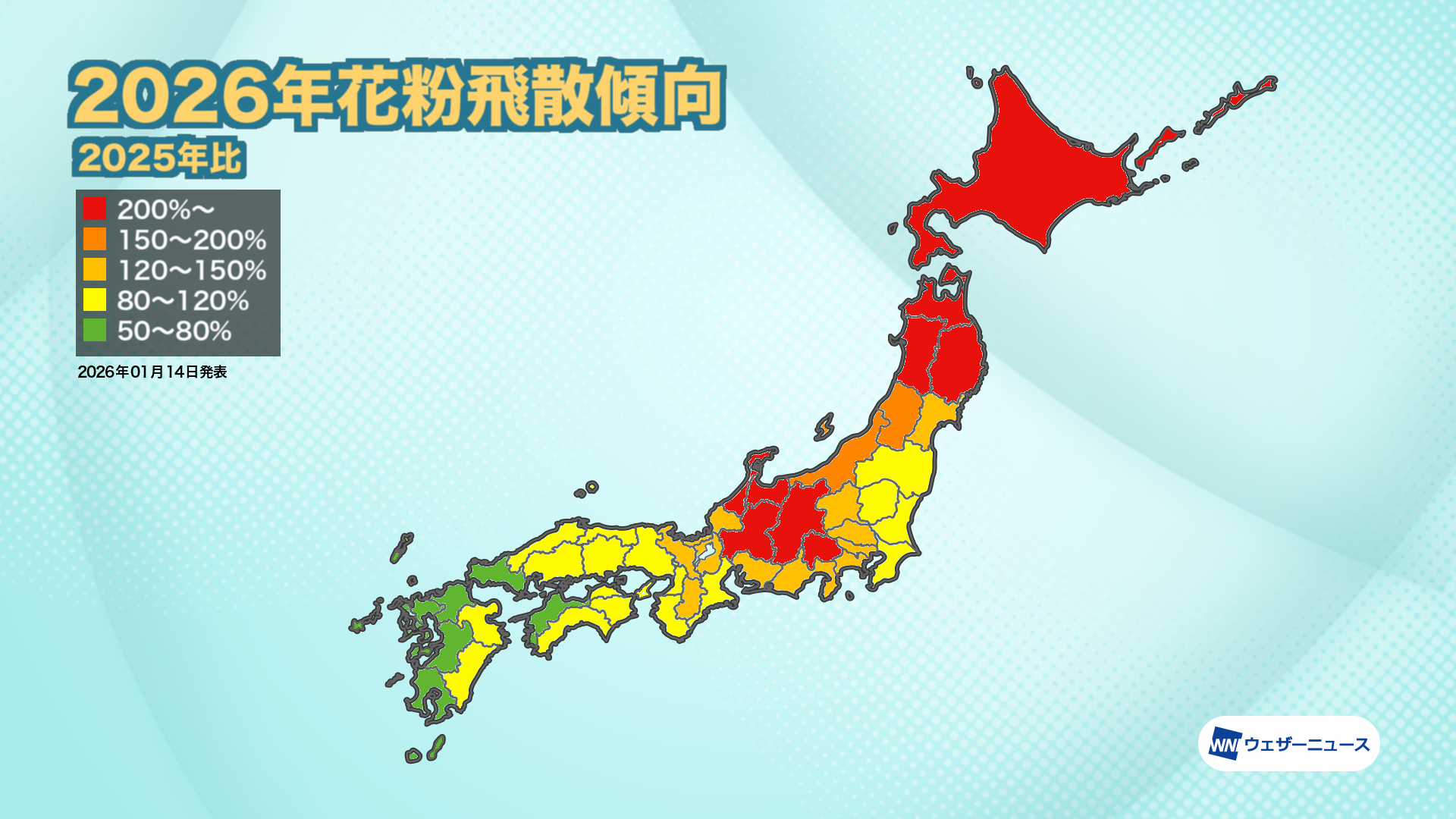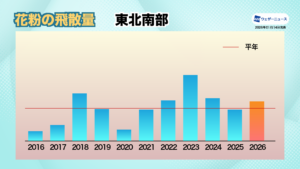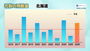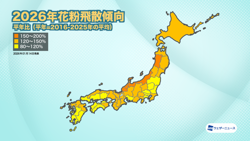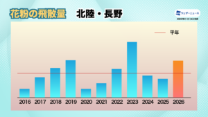 北陸・長野や東北、北海道などのエリアでは、2025年春の飛散量が比較的少なかったため、2026年は飛散量が増える「表年」になるとみています。ここに前年夏の猛暑という雄花の生長する上での好条件が加わるため、飛散量は2025年を大きく上回り、平年と比べても150%を超える地域が出てくる予想です。