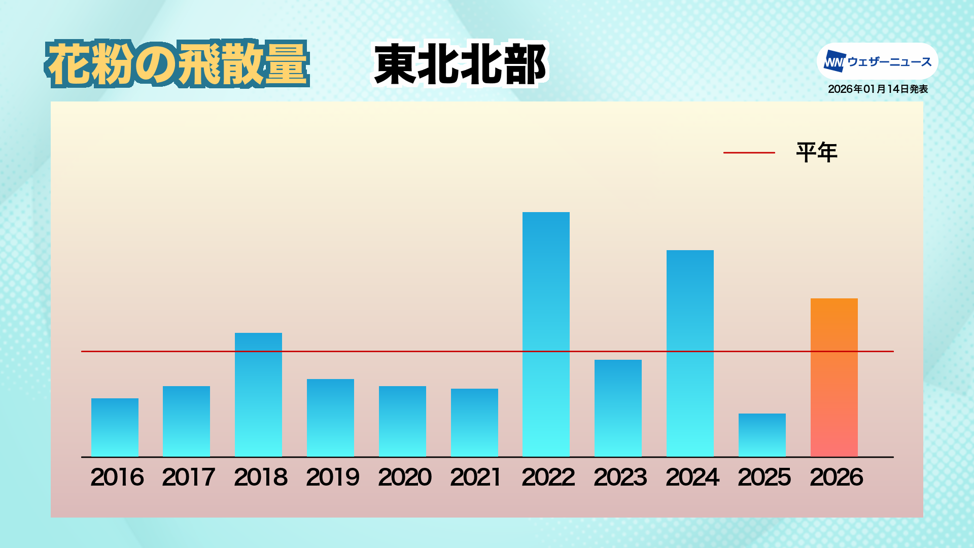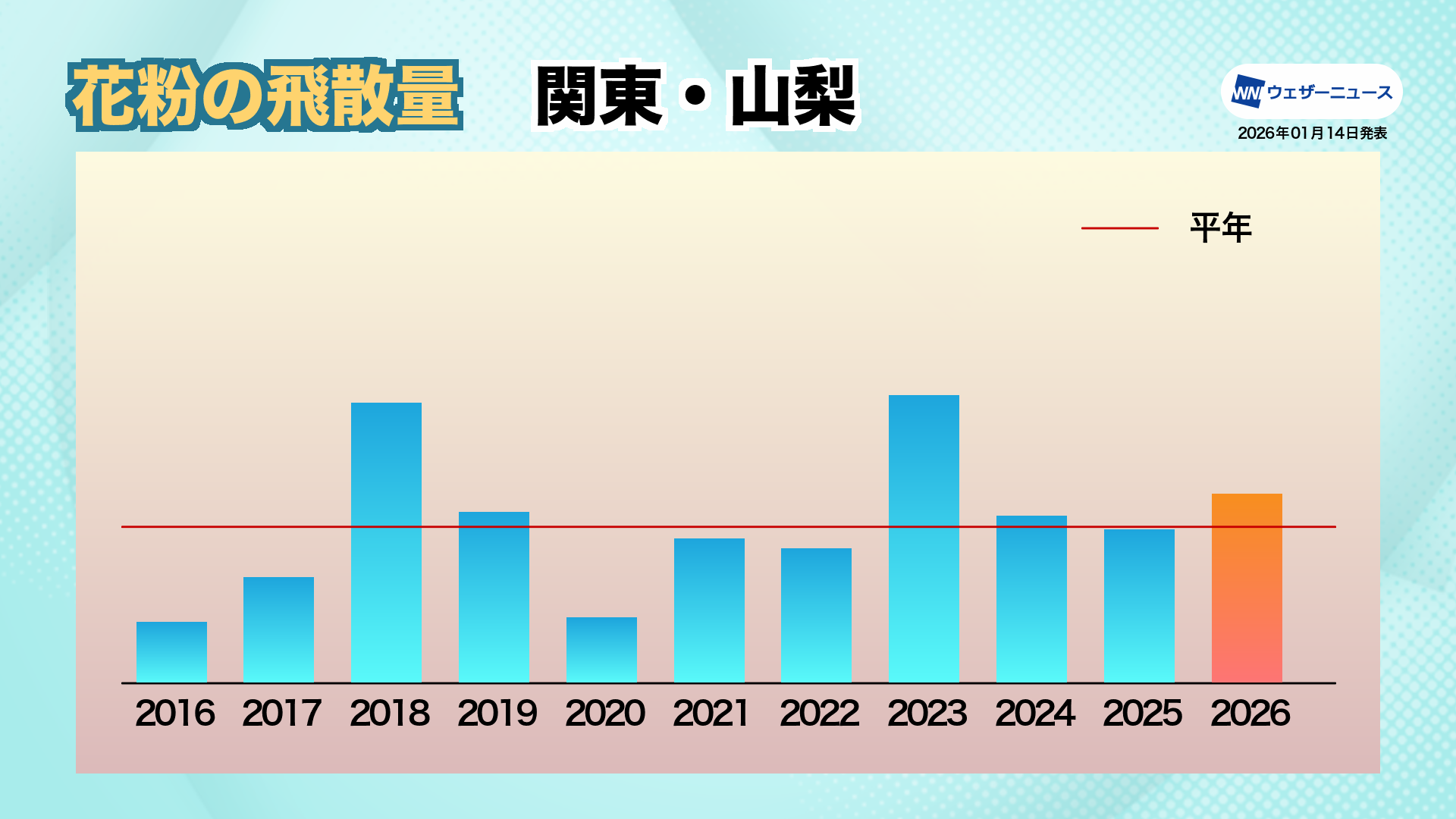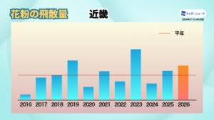 関東・山梨エリアでは近年飛散量の変動が小さく、表年・裏年の傾向が不明瞭になっています。2026年も同様の傾向が続く予想です。