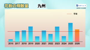2026年春の花粉飛散量は東日本と北日本で2025年を上回る地域が多い一方、西日本では前年並か前年を下回る予想です。2025年の飛散量が少なかった山梨や長野、北陸、東北北部、北海道では前年比で200%を超える地域が多く、秋田では600%を超える予想です。東北北部や北海道では近年飛散量の変動が非常に大きく、2026年は飛散量がかなり多くなる可能性があります。一方、西日本では飛散量が前年並か前年を下回るエリアが多く、2025年に記録的な大量飛散となった九州北部では飛散量が半減するエリアもあるとみています。全国平均では前年比で118%となる予想です。