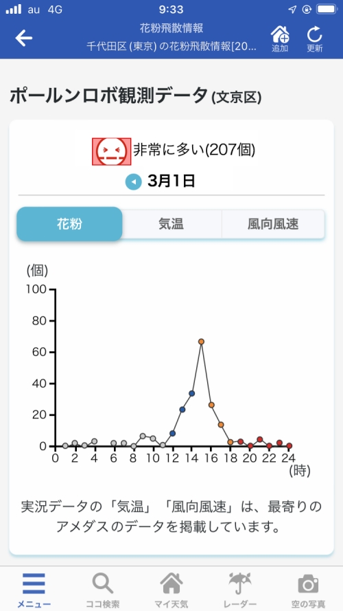 <1時間ごとの飛散予報やリアルタイムの飛散状況がわかる『花粉飛散情報』>
