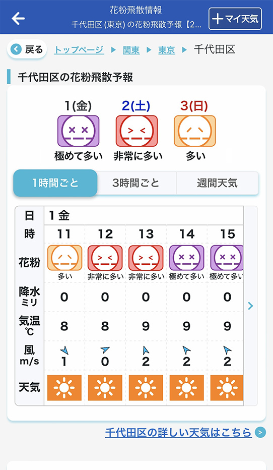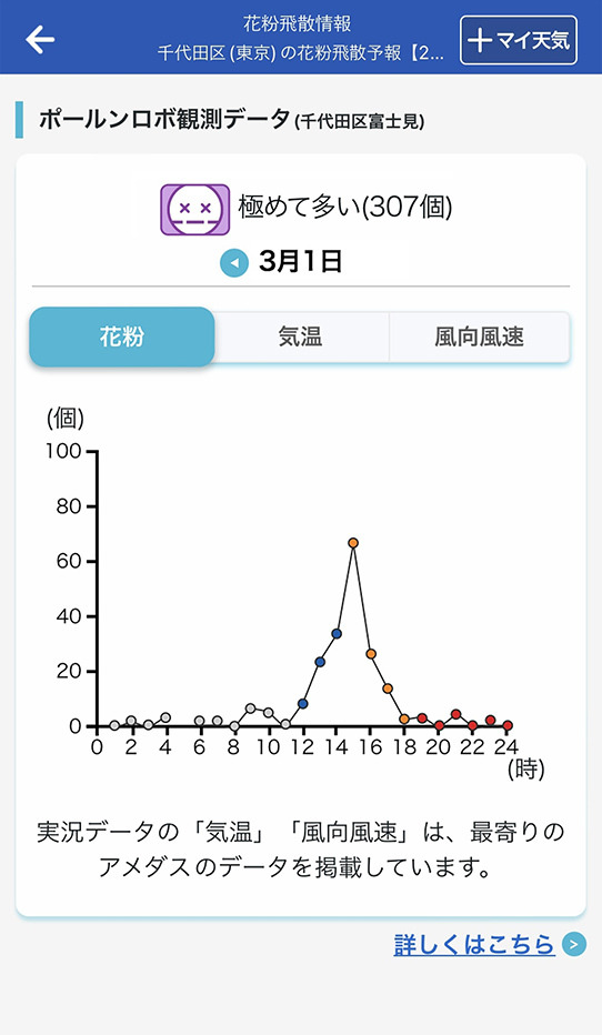 <1 時間ごとの花粉予報や週間予報、リアルタイムの飛散量をチェック『ピンポイント花粉予報』>