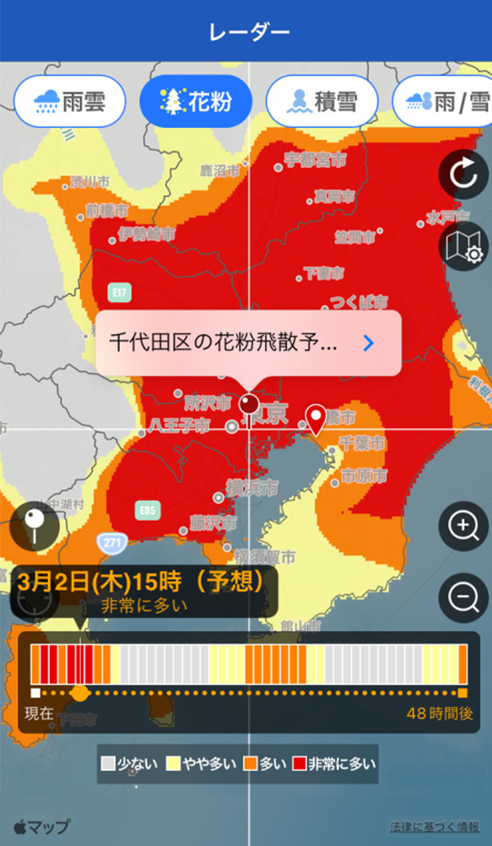 <業界No.1の高解像度で可視化!48時間先までの飛散量予測がマップ上で確認できる『花粉レーダー』>