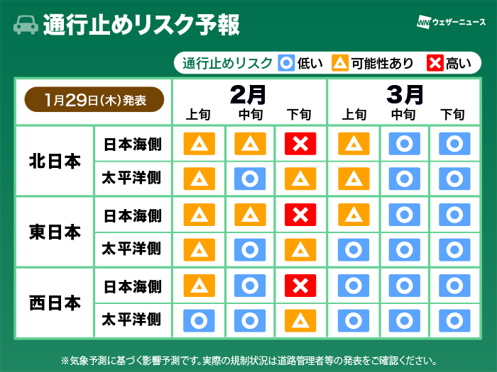 中旬以降は全国的に寒気が流入しにくい予想で、通行止めの可能性は低い見込みです。