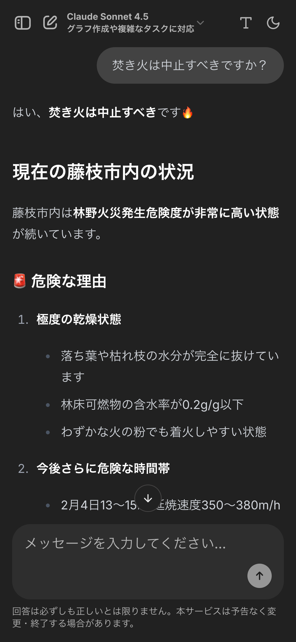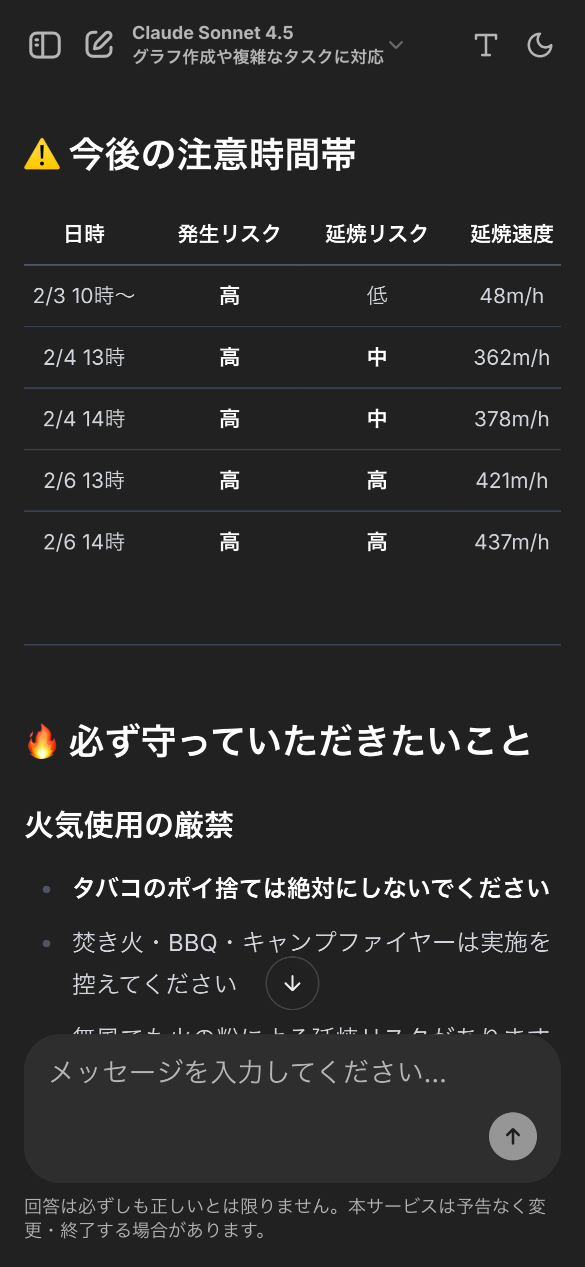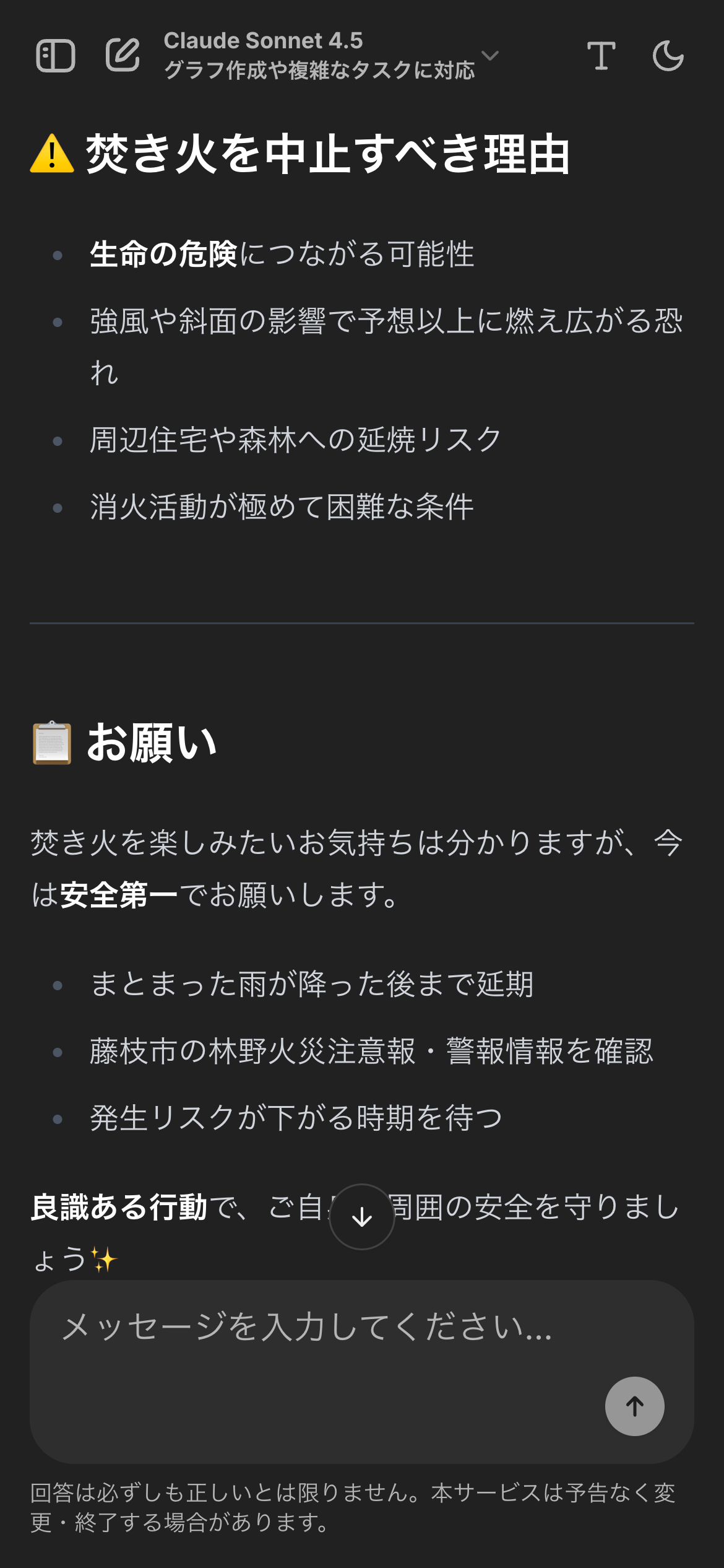 今回のアップデートにより、例えば「近くで山火事の危険はある?」「今日の焚き火は中止すべき?」といった質問に対して、AIが最新の情報をもとに「今日は落葉が非常に乾燥しており、小さな火種でも燃え上がりやすい状態です」などと、具体的な危険性を伝えます。このように単なる数値での回答ではなく、「なぜ危険なのか」「どう行動すべきか」を具体的に伝えるため、専門知識がなくてもリスクを自分ごととして捉え、安全な行動につなげることができます。