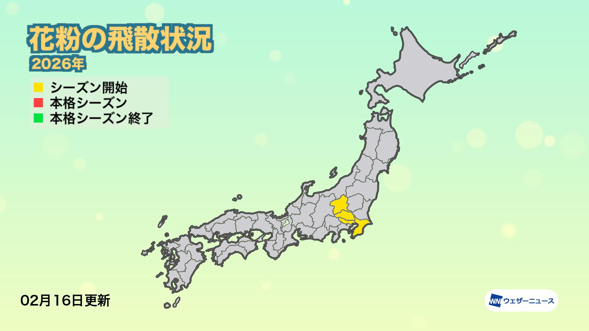 ウェザーニューズの分析では、2月16日に東京都が花粉シーズンに入りました。昨年より1日遅い飛散開始となります。また、千葉県、埼玉県、群馬県も2月16日までに花粉シーズンインしたとみられます。