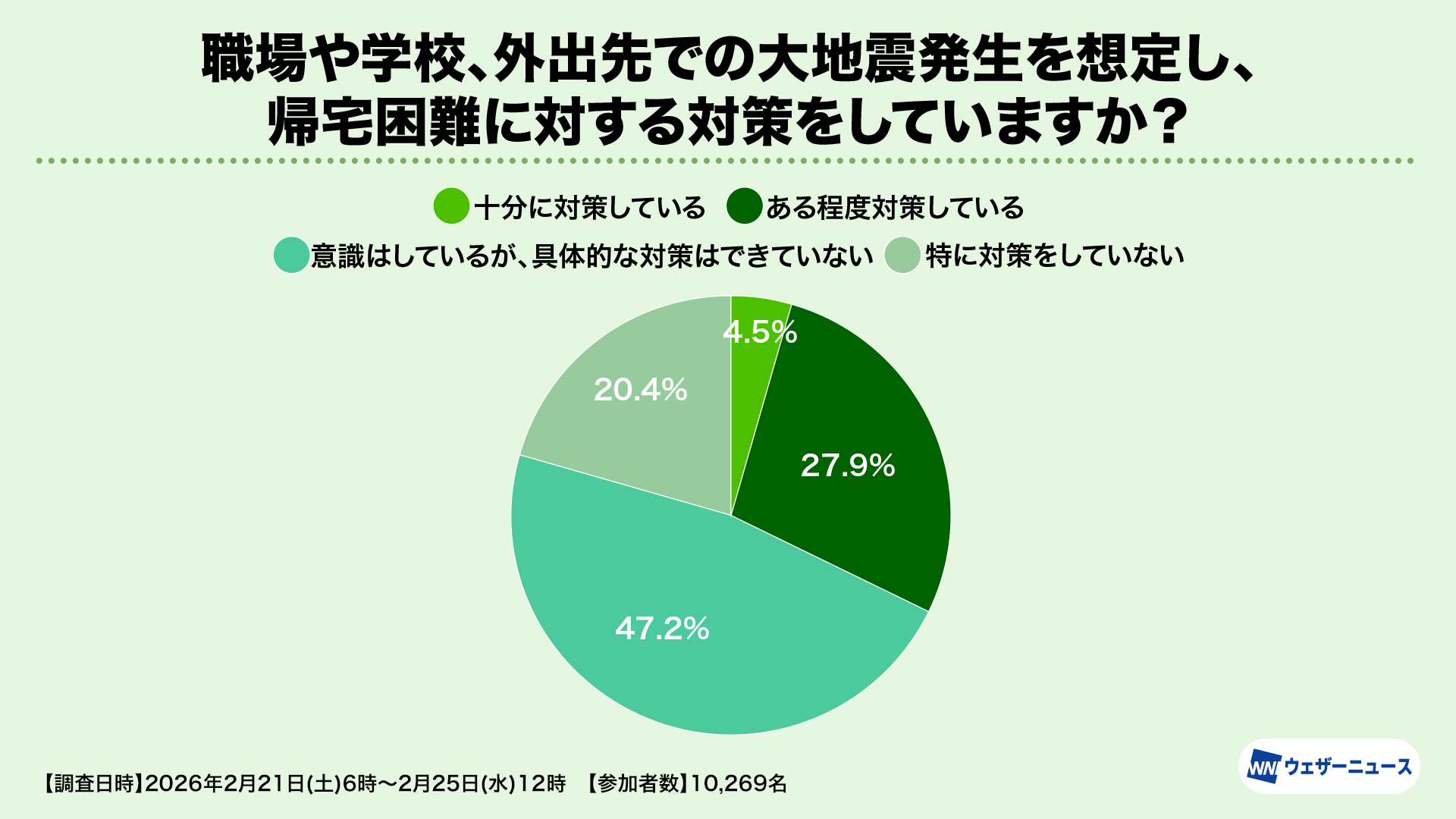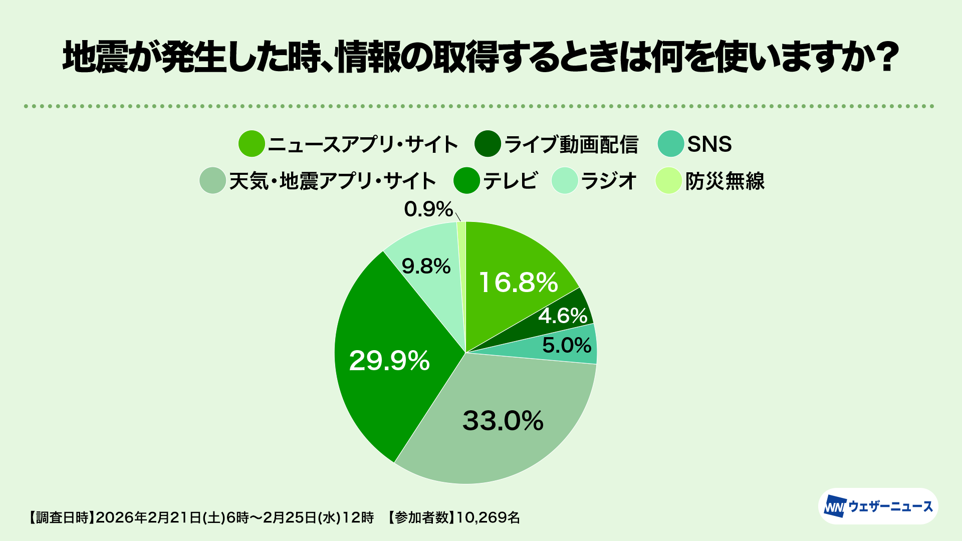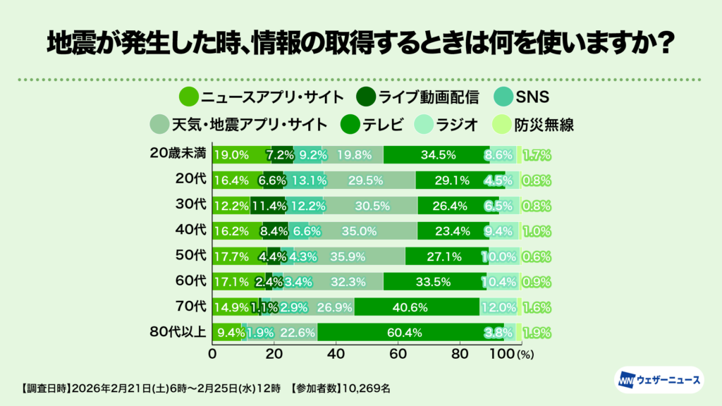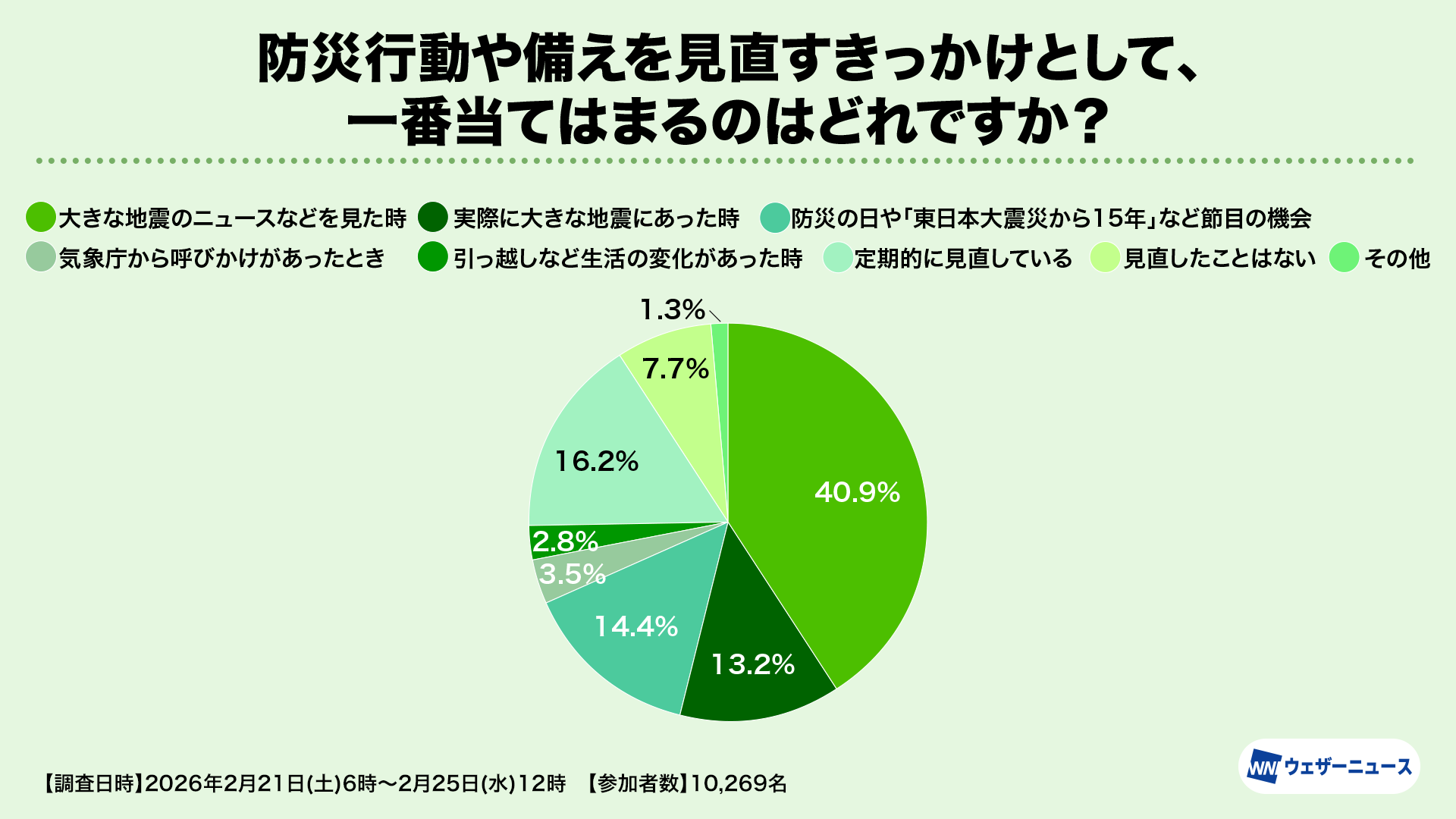 モバイル/インターネット >株式会社ウェザーニューズ(本社:千葉市美浜区、代表取締役社長:石橋 知博)は、東日本大震災から15年を迎えるにあたり、いざという時の避難行動や災害対策の一助とすることを目的として、防災・減災への意識の実態や変化を調査する「減災調査2026」を実施し、結果を発表しました。本調査は2月21日から25日にかけてウェザーニュースのアプリやウェブサイトを通じて行い、10,269人にご参加いただきました。