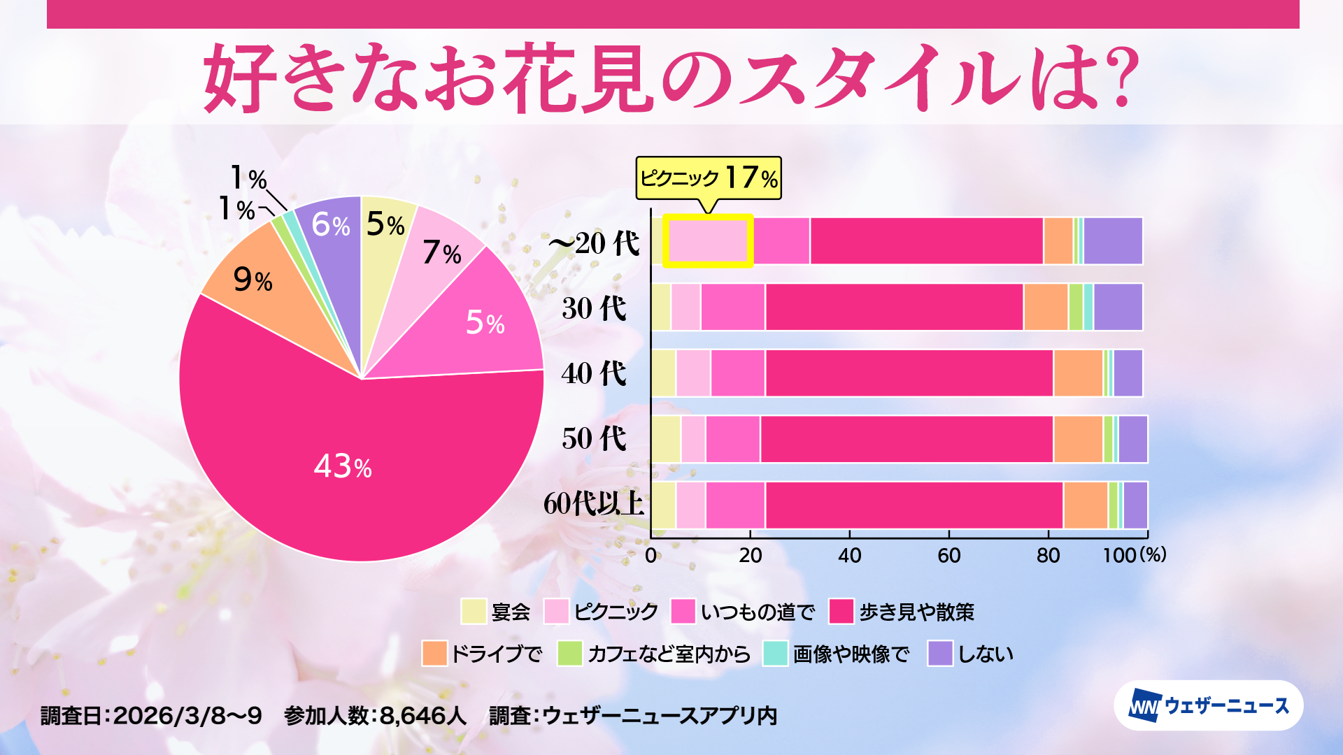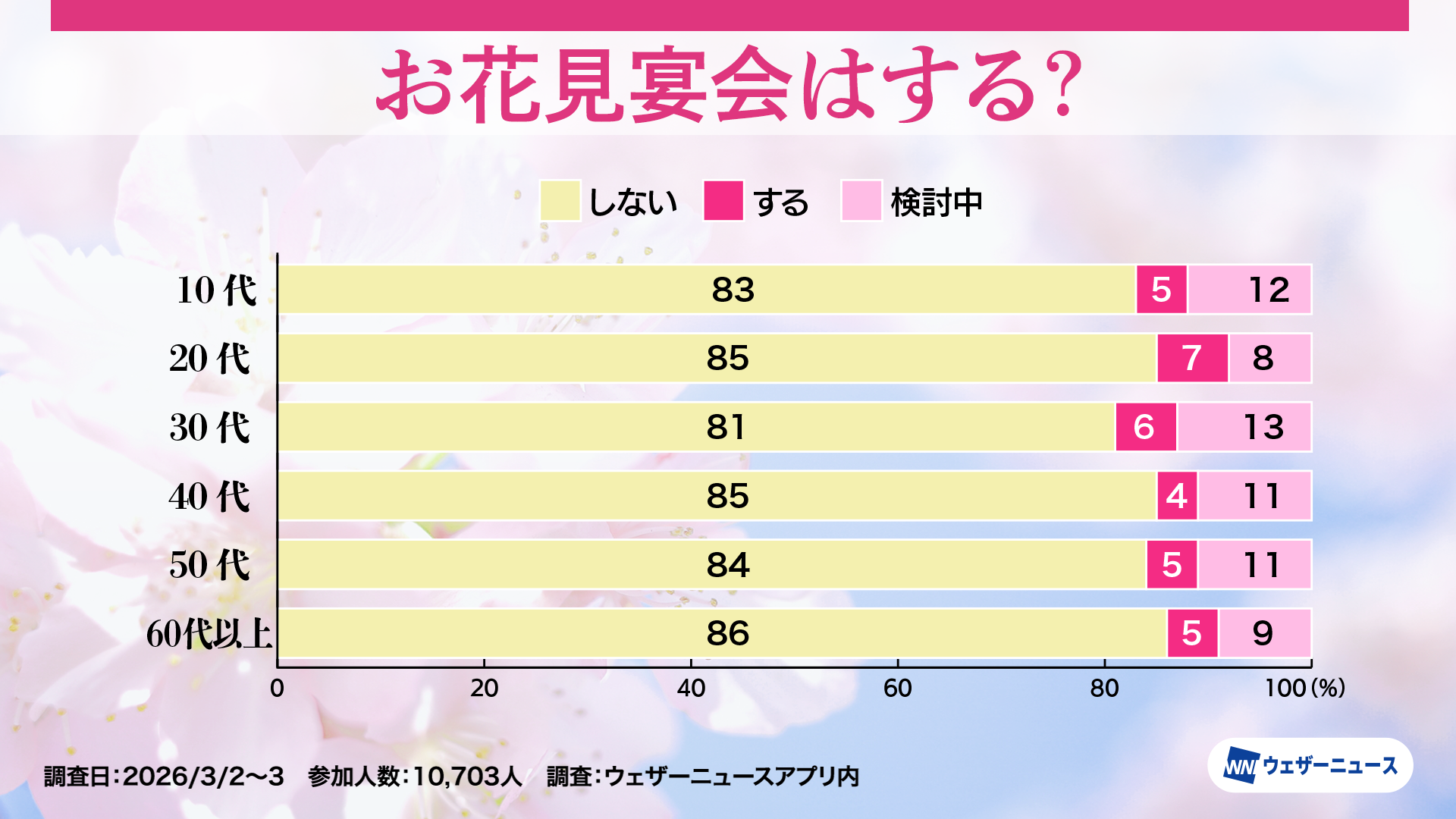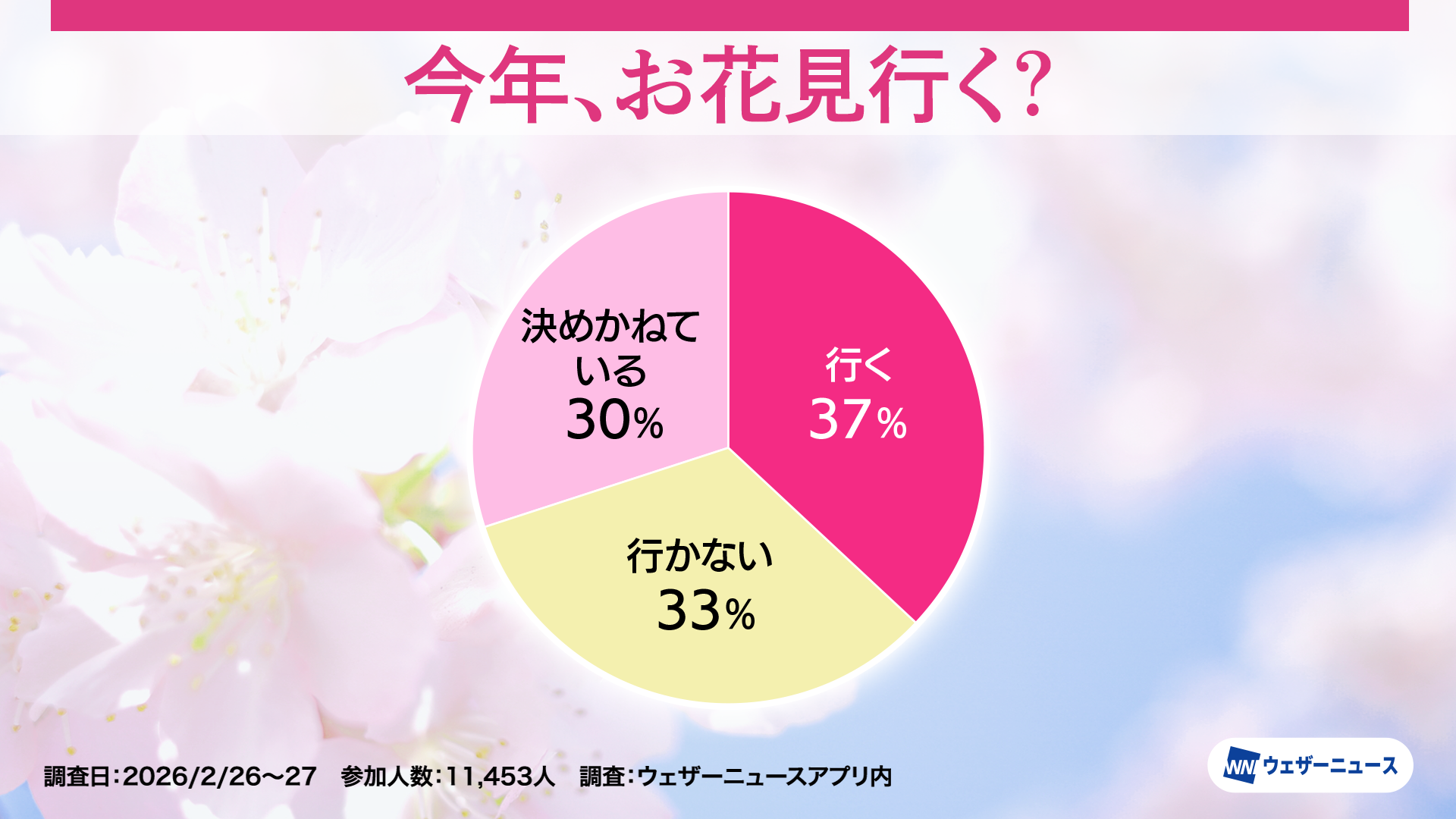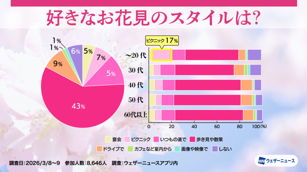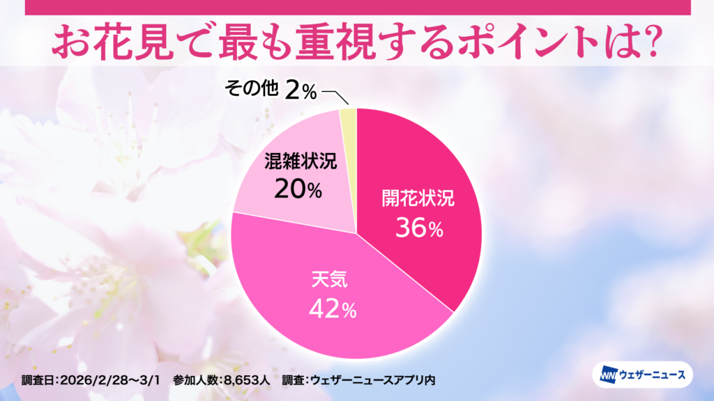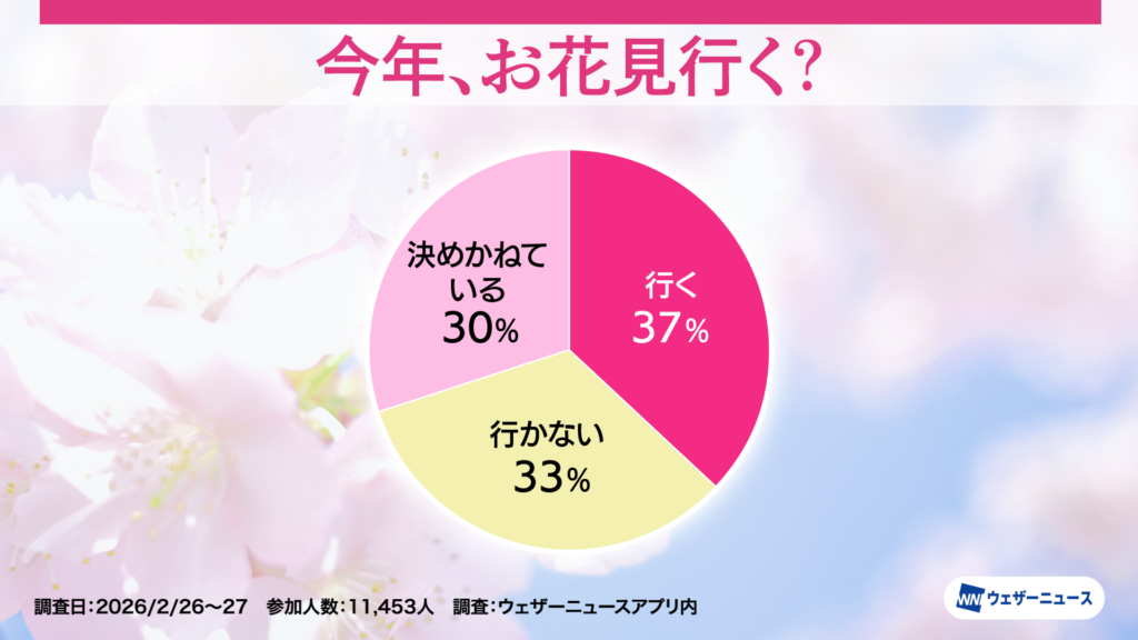 モバイル/インターネット >株式会社ウェザーニューズ(本社:千葉市美浜区、代表取締役社長:石橋 知博)は、今年のお花見への意識や人気のお花見スタイルを調査するため、スマホアプリ「ウェザーニュース」を通じて「お花見調査2026」を実施し、その結果を発表しました。