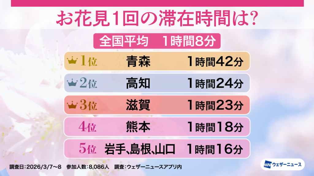 お花見の滞在時間は全国平均で1時間8分