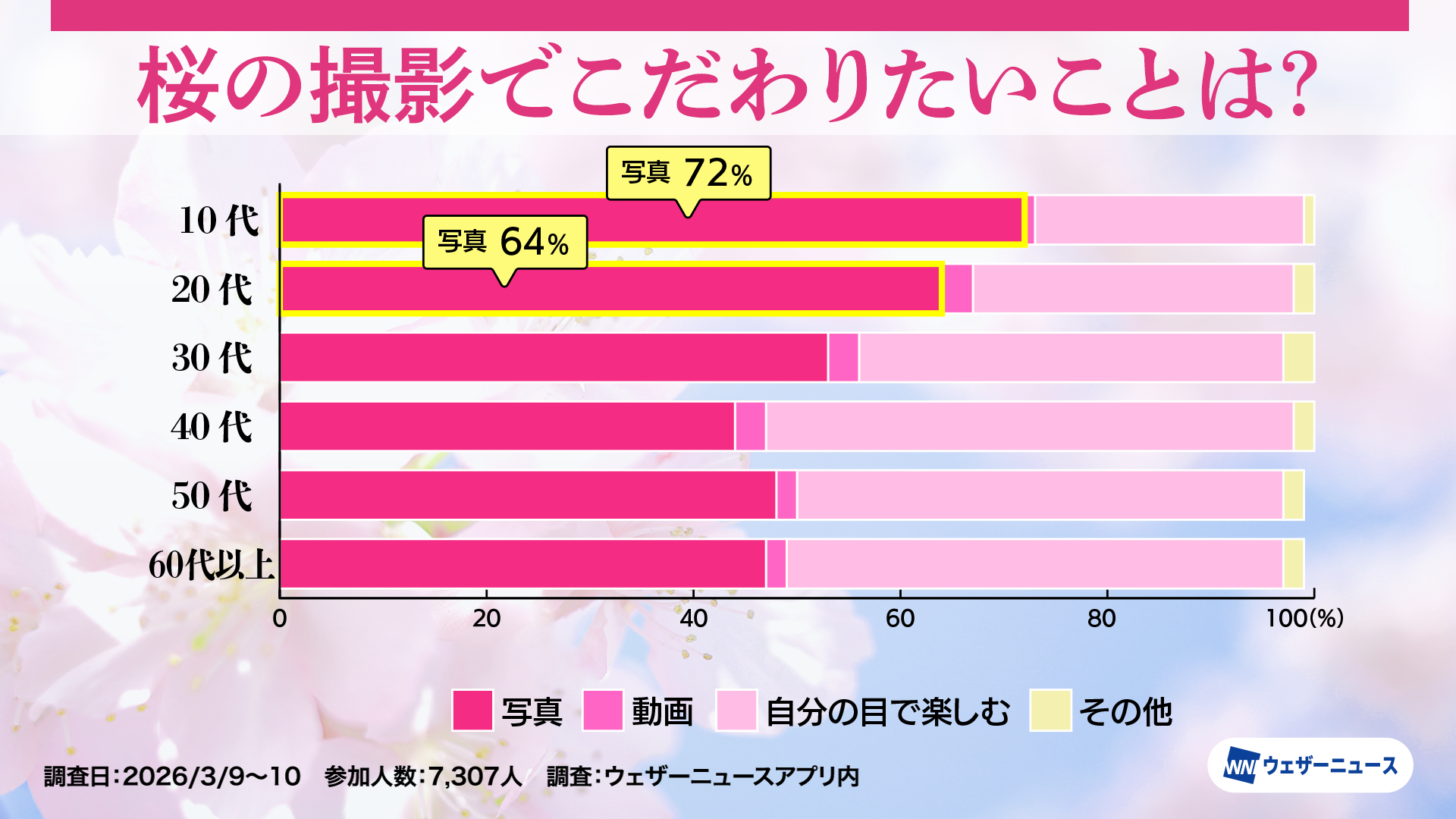 10代の72%、20代の64%が「写真」と回答し、若い世代にとってのお花見は桜の美しさを写真に収め、後から見返したりSNSで共有したりして楽しむことまでがセットになっているのかもしれません。