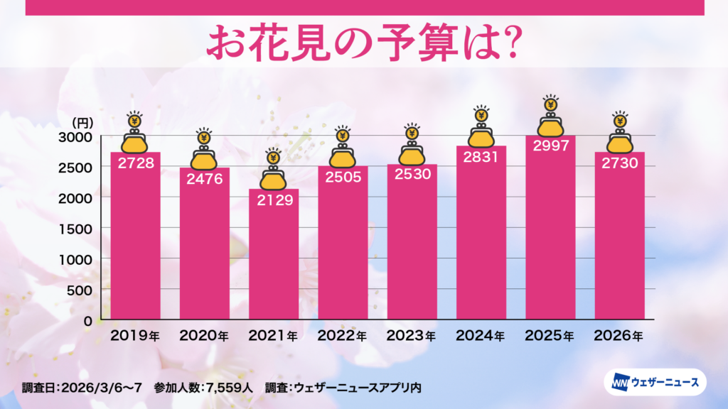「今年のお花見の予算は?」と質問し、“0円”“500円”…“9,500円”“1万円以上”から選択していただきました(※2)。回答を集計した結果、今年のお花見予算の全国平均は2,730円でした(「0円」の回答を除いて算出)。2019年以降の8年間で3番目に高額となり、コロナ禍以前(2019年:2,728円)とほぼ同水準に戻った形です。