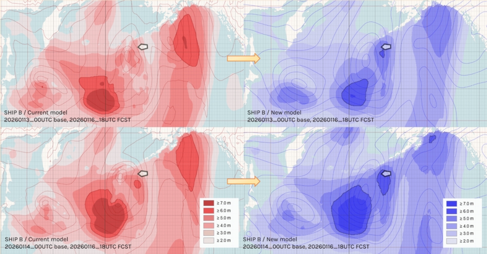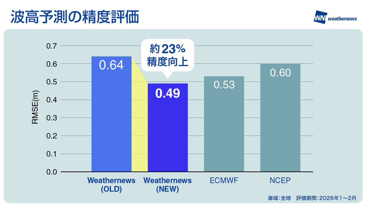 本システムにより、有義波高の予測誤差を従来比で約23%縮小することに成功しました(2026年1月〜2月の全海域における7日先までの波高予測の二乗平均平方根誤差(RMSE)を比較)。ヨーロッパ中期予報センター(ECMWF)や米国国立環境予測センター(NCEP)と比較しても、当社の波高予測が最も高精度であることを確認しています。これにより、急発達する低気圧に伴う波高の高まりも、より正確に捉えることが可能になりました。