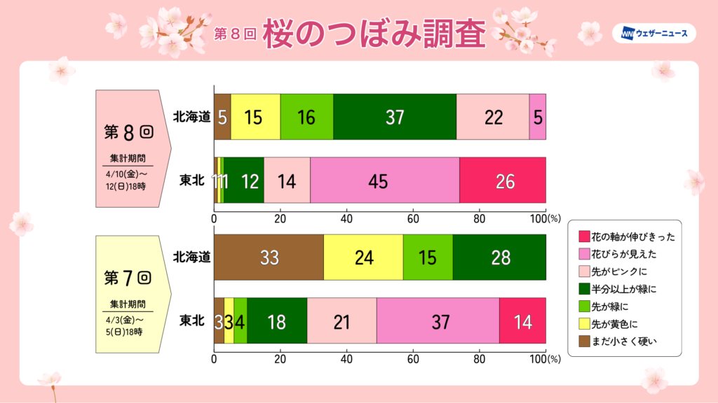 「桜のつぼみ調査」(※)の結果、東北では8割以上のつぼみが「先がピンクに」以上の報告となりました。北海道は「先が黄色に」以上が9割を超え、「先がピンクに」以上も約3割となり、開花に向けて生長をしていることが分かります。