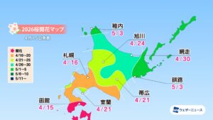 モバイル/インターネット >株式会社ウェザーニューズ(本社:千葉市美浜区、代表取締役社長:石橋 知博)は、「第十回桜開花予想」を発表しました。2026年の桜前線は北海道を北上中です。4月16日に札幌で開花し、全国で最も開花の遅い釧路方面でも5月上旬に咲き始めるとみています。
