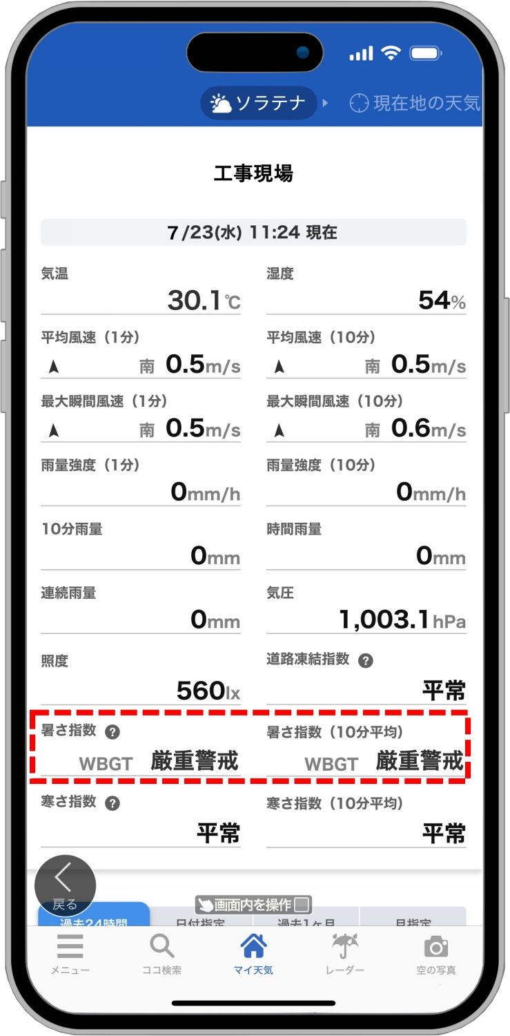 さらに、よりピンポイントな安全管理の実現のため、小型で電源を入れるだけで即座に観測を開始する、高性能気象IoTセンサー「ソラテナPro」の設置も効果的です。現場の暑さ指数(WBGT)を1分ごとに測定し、あらかじめ設定した基準値を超えた際にはプッシュ通知やメールで一斉にお知らせします。これまでも学校の体育や部活動の実施判断、建設現場の作業員の熱中症対策など、広く活用されてきた実績を活かし、今年もあらゆる現場の安全対策を支援してまいります。