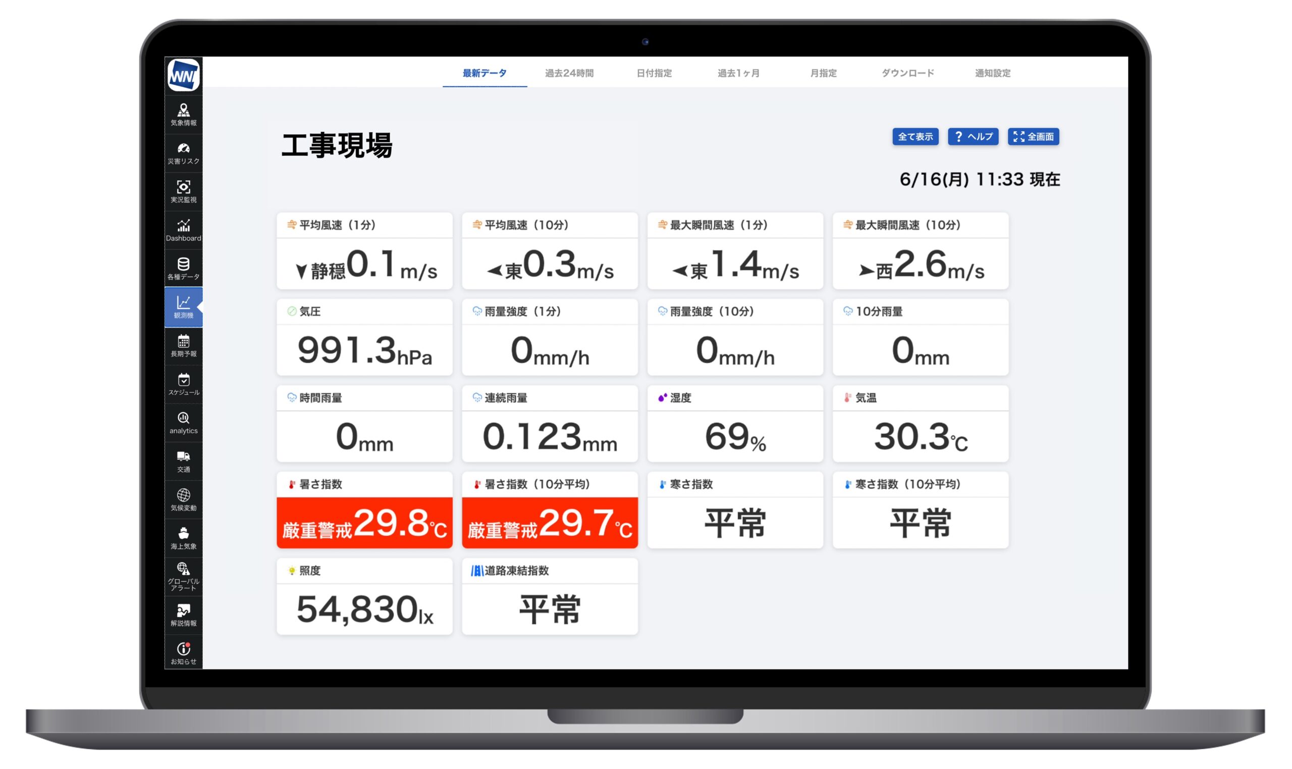 現地の熱中症リスクを把握したい場合には、小型の気象IoTセンサー「ソラテナPro」(NETIS登録製品・気象庁認定製品)(※2,3)の活用も有効です。「ソラテナPro」は、気温・湿度・気圧・雨量・風向・風速・照度の7つの要素を1分ごとに観測し、確認することができます。観測した気温・雨量・風速などをもとに暑さ指数(WBGT)を算出し、アプリやWebサイトに表示する機能を備え、現地の熱中症リスクをリアルタイムで見える化し、対策を促すことができます。さらに算出した暑さ指数が設定した基準値を超えた場合には、アプリのプッシュ通知やメールでお知らせし、回転灯(表示灯)のような各種メール通知をトリガーにした企業側のシステムや機器との連携も可能となっています。