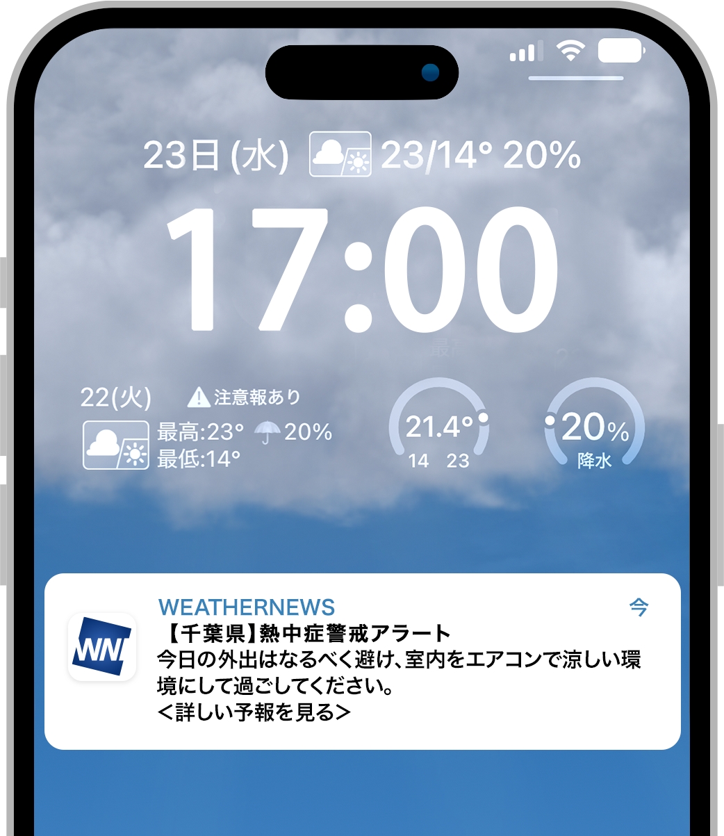 「ウェザーニュース」アプリでは、熱中症警戒アラートおよび熱中症特別警戒アラートが発表された際に、ユーザーへ即時にプッシュ通知します(無料)。熱中症警戒アラートは熱中症の危険性が極めて高くなると予想される日の前日17時頃と当日朝5時頃に発表されるため、事前の対策や予定の変更などに役立ちます。